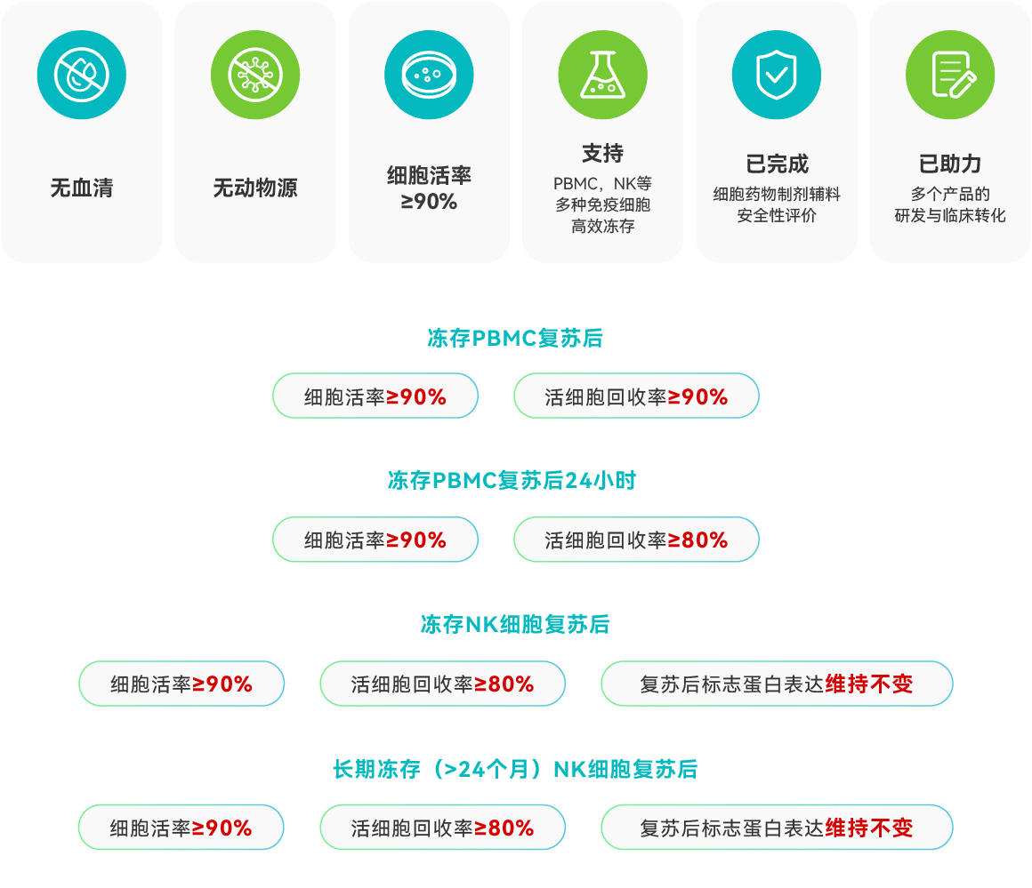 产品特点:即用型、安全高效、DMSO含量低,所有成分均为辅料/药用级别;已完成细胞药物制剂辅料安全性评价;支持临床级/药品级细胞培养及冻存;复苏后细胞活率高于90%;已助力细胞治疗领域多个产品的研发与临床转化